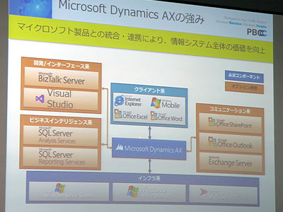 「Dynamics AX」は、マイクロソフトが提供する標準機能のコア部分と、パートナーが提供する業種別ソリューションなどのアドオン部分、さらにユーザー固有のカスタマイズ部分がレイヤー構造となっており、開発や保守が容易なことが特徴。このため、カスタマイズ部分も少なくなり、構築期間や導入コストも低く抑えられる。