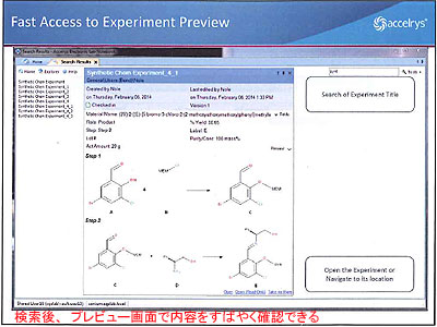 2014.05.10−アクセルリスは、電子実験ノートブック(ELN)の最新バージョン「Accelrys Electronic Lab Notebook 6.9」(Accelrys ELN)を6月末にリリースする。検索機能や実験データのトレーサビリティーを高めるほか、モバイル端末との連携機能を本格的に組み込む。最近、一連の論文疑惑で、おおもとの実験データが散逸して経過がたどれないことが問題視され、データ管理の不備が指摘されてもいる。そうした背景のもと、実験の真正性や公正性を担保できるツールとして、ELNへの関心が企業だけでなく、公的研究機関や大学などからも高まってきた。同社ではさらにユーザーニーズを反映させて、継続的に機能を高めていく。