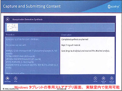 一方、実際のユーザーからの反響が大きいのが、モバイル機器と連携した“Accelrys Mobile Data Capture”機能。実験前のプランニングや最後のまとめはPCで行うが、実験室内にはタブレット端末を持ち込んで作業したいというニーズが増えている。GxPなどの規定では、実験室内で付箋などに記したメモも、それが一次データとみなされるため、その付箋を実験ノートに貼り付けて管理する場合があった。そのため、実験中のメモ書きも電子化してELN内に保存しようという動きが出てきている。タブレット端末を実験室で使用し、それで写真と撮ったり、メモをとったりして、そのままPC側のELNに送信することが可能。