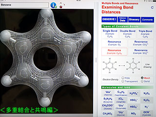具体的には、「Atomic Orbitals」(原子軌道編)、「Electron Sharing」(電子共有編)、「VSEPR Theory」(原子価殻電子対反発理論編)、「Multipul Bonds and Resonancve」(多重結合と共鳴編)、「Substances」(身近な物質編)、「Elements」(周期表と元素編)、「Lattices」(結晶格子編)、「Functional Groups」(主要な官能基と代表的な化合物編)、「Property」(化合物のプロパティ編)、「Ionic Solids」(イオン結晶編)があり、それぞれ約400円でダウンロードできる。