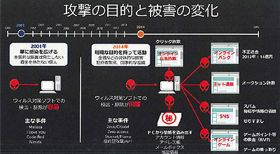 同社の説明によると、XP発売当時の2001年と比べて、インターネットの利用者が大幅に増え、利用方法も変わったことに加え、ウイルス作成者などの攻撃の目的と被害の大きさが格段に変化したため、設計が古いXPではこうしたネットワークの脅威への対応が難しくなっているという。例えば、2001年当時はウイルス作成者の動機は感染を広げたいだけのいたずら目的で、実害はほとんどなかった。ところが、現在ではプロ的な犯罪者集団や国家的な組織が明確な目的を持って活動しており、その被害も段違いのレベルに達している。オンラインバンクの不正送金被害に限っても、昨年は14億円の被害があったが、今年は1月と2月だけで6億円の被害が出ている。