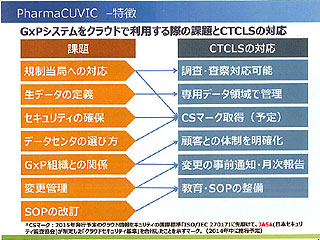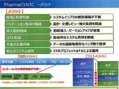 2014.07.02−CTCライフサイエンス(CTCLS)は6月19日、医薬品や医療機器の開発・製造に使用されるITシステムに要求される“コンピューター化システムバリデーション”(CSV)に対応したIaaS型クラウドサービス「PharmaCUVIC」(ファーマ・キュービック)の提供を開始すると発表した。CSVに適応した業務システムを稼働させるためのインフラと運用管理サービスを提供するもので、初期導入費用と月額サービス料で利用することが可能。CSVに必要な各種文書の準備や当局による査察への対応などの負担が大幅に軽減される。システムの導入期間も、オンプレミスの場合に比べて最大で4ヵ月程度短縮できるという。