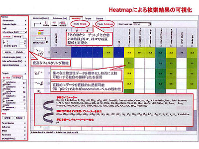 とくに、こうした豊富な情報量を生かす工夫が今回新たに搭載された「ヒートマップ」機能。これは、行列をもとに数値の大小を色の濃淡などで視覚的に表現する解析グラフの手法で、化合物とターゲット、化合物と細胞種などさまざまな相互関係を表形式に並べて比較することができる。特定のターゲットや細胞種に対する化合物の親和性を定量化した独自の“Px値”で並べ替えたり、生物種の違いやin vivoかin vitroか、セルラインなど切り口を変えたりすることにより、親和性の高い範囲の目安を簡単に読み取ることができるという。本来の標的とは異なるオフターゲットの可視化も可能である。