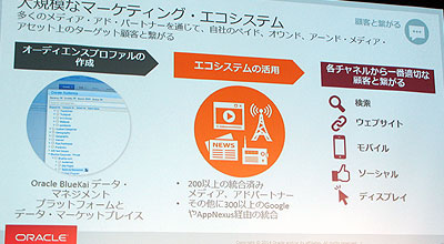 これらに加え、今回新製品として提供されるのがクラウド型データマネジメントプラットホーム「Oracle BlueKai」。ビッグデータの中から最適な見込み客を抽出するためのツールで、従来はばらばらだったマーケティングデータを1つに集めて統合し、その行動・業種・属性などからセグメント化とターゲット化を行い、戦略的に利用できる顧客プロファイルを作成。ディスプレイ広告や検索あるいはソーシャルメディアといった各種のチャネルを通じて、対象顧客ごとにパーソナル化された広告配信を最適なタイミングで実施することができる。