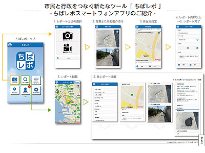 2014.08.30−千葉市(熊谷俊人市長)は28日、ICTを活用した市民協動のまちづくりを目的とした「ちば市民協動レポート」(ちばレポ)を本格的にスタートさせると発表した。セールスフォース・ドットコムが提供するクラウド型モバイルプラットホームのSalesdorce1を基盤に構築しており、市民がみつけた道路の陥没などの不具合をスマートフォンでその場から送信してもらい、ウェブ上にそのレポートを公開する。可視化された地域の課題を市民と市役所が共有し、速やかに解決に当たろうというもの。ICTを活用して市民が市政に参加する取り組みは全国でも初で、千葉市ではこのシステムを他の自治体にも広げるよう努力していく。