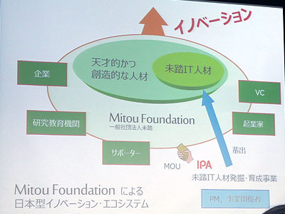 IPAの「未踏IT人材発掘・育成事業」は10年間で延べ1,600人の人材を生み出し、そのうちの260人ほどは際立った能力を持つスーパークリエーターに認定されている。しかし、社会的な認知度が低いため、未踏出身者の多くはその能力を十分に発揮できない職場で働いたり、外資系企業に流出したりしていたという。