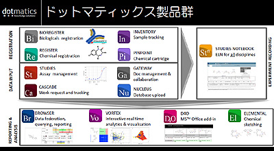 ブラウン氏「電子実験ノートのSTUDIES NOTEBOOKを中心に、化合物情報を登録するREGISTER、生物情報登録のためのBIOREGISTER、サンプル管理のためのINVENTORY、さらにアッセイデータ管理のSTUDIES、作業指示とトラッキングのCASCADE、化合物情報とリンクしたドキュメント管理やコラボレーションが行えるGATEWAY、データ統合とデータベースへの自動登録を行うETLツールのNUCLEUSなどが揃っている。また、蓄積・取得した大量のデータを活用するための製品群として、データ連携・照会・レポーティングのためのBROWSER、対話的にデータ解析・可視化を行うVORTEX、マイクロソフトオフィス上で化学構造を扱えるようにするD4Oなどが利用できる」