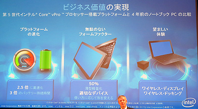 2015.04.03−インテルは2日、第5世代「インテル Core vPro プロセッサー」製品ファミリーを発表した。モバイル使用を想定した企業向けの機能強化に重点が置かれており、先進のワイヤレス機能によってオフィスからケーブルをなくし、職場の環境を一新させることで、ビジネスの革新的なアイデアを生み出すような“仕事術”を実現させるとしている。同社は、今回の技術を採用したPCを実際に社内で活用し、導入効果などを検証していくことにしている。