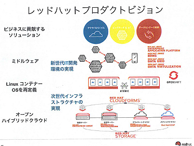 ワールドワイドでの前年度実績は、売り上げが17%増の17億9,000万ドル。すでにLinuxだけの企業ではなく、ミドルウエアや仮想化、クラウド、ストレージも含めたオープンソースソフトウエア(OSS)領域を広くカバーしている。国内でも前年度は、金融、製造、通信、官公庁などでOSS採用が加速し、データセンター向けでRedHat Enterprise LinuxとJBossミドルウエアが成長したほか、ビッグデータ関連でSDS(ソフトウエアデファインドストレージ)やミドルウエアを含めて50%以上の伸びをみせたという。