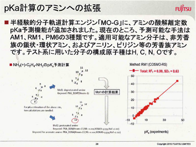 一方、最新バージョンのもう1つの目玉が、アミンの酸解離定数(pKa)予測機能。これは、Cumulated Bond Order(CBO)をベースに、結合次数の和を使ってQSPR(構造物性相関)のための良い記述子がつくれないかという着想に基づく研究が土台になっている。結果的には、CBOを利用すると、計算手法が半経験的方法(MO-G)でも密度汎関数法(GAMESS)でも同等の予測精度が出ることがわかり、いずれの場合も従来のQSPRより精度は高かったという。この手法を、84種類の非芳香族アミン、49種類の芳香族アミンで評価したところ、相関係数0.98−0.99を得たという。