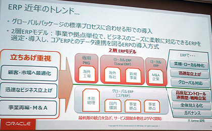 最近のERP市場のトレンドとして、2層ERPモデルが広がってきている。本社のコアなERPはグローバルスタンダードなオンプレミス型ERPを引き続き使用し、拠点単位の活動や新しい事業を支えるERPにはコストと柔軟性に優れるクラウド型を採用して、コアのERPとのデータ連携を図るというもの。ただ、クラウド型をさみだれ式に導入した結果、コアのERPとのデータ連携がうまくいかないケースも散見されるという。「Oracle ERP Cloud」は、オンプレミスもクラウドもすべて単一のリポジトリにデータが格納されるため連携が容易であり、あらゆる角度からのデータ分析も可能。今後、“POCO”(The Power of Cloud by Oracle)をキャッチフレーズに、同社のクラウドソリューションの価値の浸透を図っていくとしている。