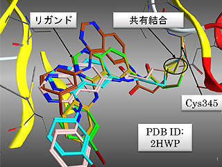 電子密度ドッキングは、リガンドの歪エネルギーを最小化しつつ電子密度とのフィッティングを最大化する仕組み。力場エネルギーと電子密度を考慮した新ドッキング法となっている。また、共有結合性ドッキングは、受容体と共有結合を形成するリガンドのドッキング解析で、インデュースドフィットにより受容体とのフィッティングを考慮しつつ、結合ポケットの中でリガンドの構造最適化を行う。反応式によって共有結合を定義できるのでわかりやすいことも特徴。