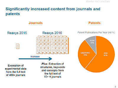 今回のReaxys2016では、収録コンテンツの大幅な拡充を実施。2015年版では400誌以上の化学系ジャーナルのフルテキストから実験データを抽出していたが、2016年版はそれに加えて1万5,000誌以上のジャーナルフルテキストから構造情報や化学関連のキーワードを抽出し索引付けしている。また、新規化合物が多く収載される特許情報からは、2015年版で追加した日本と韓国に加え、2016年版は中国と台湾の特許をカバーした。