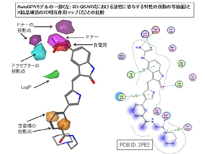 そのほか、MOEにはSVLライブラリーに豊富なアプリケーションが公開されており、それらも活用することができる。その中には菱化システムが開発・提供しているものも多いが、今回の最新版リリースに合わせて自動3D-QSAR解析ツール「AutoGPA」もバージョンアップされた。3D-QSARは、化合物が標的に結合する際の配座(活性配座)を仮定し、その3次元空間上で分子記述子を利用したQSAR解析を行う手法。分子記述子に静電ポテンシャルとファンデルワールスポテンシャルを利用する“CoMFA法”がよく使われる。 AutoGPAは、活性配座が不明でも、活性化合物の活性値と安定配座から自動でファーマコフォアベースの分子群の重ね合わせ、CoMFA法による相関式の構築、スクリーニング、リガンドデザインまでを行う機能があり、MOEユーザーに広く利用されてきている。