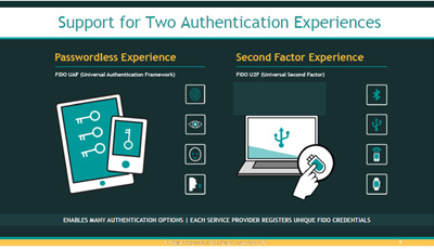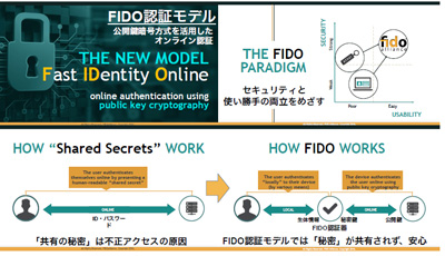 規格としては、FIDO対応デバイスを用いてパスワードを使わず認証する“UAF”(Universal Authentication Framework)と、2要素認証技術を発展させた“U2F”(Universal Second Factor)の2つがある。最新のFIDO1.1では、スマートカード、ブルートゥース、NFC(近距離通信)、拡張メタデータサービスのサポートなどの機能拡張が施されている。