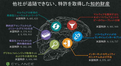 マルウエアがつくられる前から検知できるのは、シグネチャーではなく、AIによってマルウエアのコードそのものを分析し、マルウエア特有の特徴を持つかどうかを判定しているため。同社では、正常なファイルを含む10億個のファイルサンプルを用いた複雑な機械学習を実施し、700万点にも及ぶ特徴点を抽出、それをもとにマルウエアを判定するための数学モデルを構築している。すでに、AI関連で8つの特許を取得しており、技術的優位性は明らかだという。