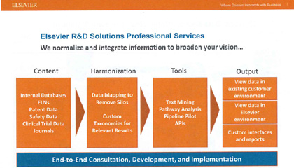2017.09.28−エルゼビア・ジャパンは、欧米の製薬・化学メーカーで需要が増えているプロフェッショナルサービスを、国内でも本格的に実施していく。企業の内外に分散している各種データソースをまとめ、漠としたデータから的確な知識を引き出すことを目的としたもの。同社が培ってきた高度なデータインテグレーション技術、データアナリシス技術を駆使して、顧客ニーズにカスタム対応する。