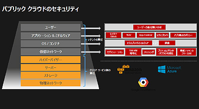 パブリッククラウドのセキュリティは見過ごされている場合が多く、物理ネットワークやサーバー、ストレージなどのセキュリティはクラウド事業者が責任を持つが、その上のレイヤーである仮想ネットワークやOS/コンテナ、ミドルウエア、アプリケーションなどのセキュリティは利用者が責任を持って対策する必要がある(別図参照)。とくに、公開ウェブアプリケーションなどを運用している場合、パブリッククラウドであるかどうかに関わりなく、外部から攻撃を受ける可能性があるという。