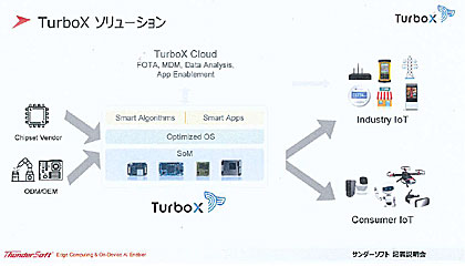 とりわけ、日本市場とのからみでアプリケーションとして狙っているのが“スマートIoT”の分野。すでに「TurboX」と呼ぶソリューションを開発ずみで、組み込み製品に最適化し、高品質・短期間での製品開発が可能なシステムオンモジュール(SoM)を提供している。AI機能を搭載できる大小さまざまなコアモジュールを用意しており、スマートIoTデバイス開発に利用することが可能。クラウドを含めたトータルパッケージで製品化している。