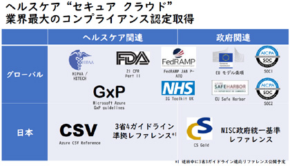 クラウド基盤としては、グローバルおよび国内の規制に対応した認定を取得しており、製薬会社などが従う必要があるCSV(コンピューター化システムバリデーション)についても、今年4月にパートナー(TIS、アバナード、JSOL、NTTデータ)と共同で「Azure対応CSV適用リファレンス」を作成している。電子化された医療情報をクラウドで扱うための「3省4ガイドライン」(厚生労働省の『医療情報システムの安全管理に関するガイドライン』、総務省の『ASP・SaaS における情報セキュリティ対策ガイドライン』『ASP・SaaS 事業者が医療情報を取り扱う際の安全管理に関するガイドライン』、経済産業省の『医療情報を受託管理する情報処理事業者における安全管理ガイドライン』)にも対応している。
