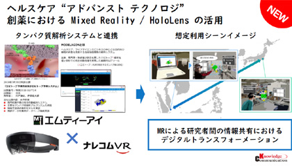 複合現実(ミックスドリアリティ)製品「Microsoft HoloLens」の活用事例では、オハイオ州のウエスタンリザーブ大学で解剖学の研修に使用されているほか、Holoeyes社の手術シミュレーションシステムなどの事例がある。加えて、エムアイティーとナレッジコミュニケーションが実施している実証実験も紹介された。これは、タンパク質の抗原部位を予測するエピトープ解析を自動で行うシステムで、HoloLensとAzureの組み合わせにより、3Dモデルを遠隔地の研究者同士が共有して、抗体医薬開発を効率的に進めるというもの。