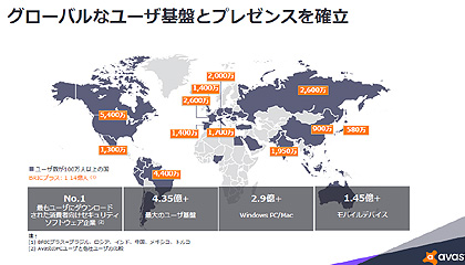 同社は、1988年にチェコで設立されたベンダーで、今年5月にロンドンに上場。無料のウイルス対策ソフトなどで知られており、追加機能を有償で提供する“フリーミアム戦略”と呼ぶビジネスモデルを採用している。ワールドワイドでは、パソコン向けで2億9,000万、モバイルデバイス向けで1億4,500万のユーザーベースを持つ。日本にも580万人の利用者がおり、今年5月には日本語によるテクニカルサポートセンターも開設している。