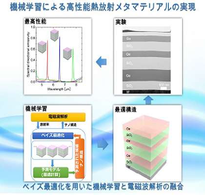 物体が熱を電磁波として放出する熱放射現象は、波長制御ヒーターや赤外線センサー、熱光起電力発電などさまざまなエネルギーデバイスへの応用が期待されている。熱放射エネルギーを効率良く利用するためには、有用な波長帯での熱放射スペクトルを狭帯域化させることが重要で、電磁波を自在に操ることができるメタマテリアルをターゲットにした研究が盛んに行われている。ただ、経験的に構造を選択してそれを評価するという経験的・実験的アプローチが主流であり、最適なメタマテリアルを経験に頼らずに設計することは困難だった。