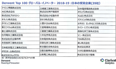 なお、日本からランクインした39社は写真に掲載したとおり。このうち、キヤノン、富士通、日立製作所、本田技研工業、NEC、日東電工、NTT、オリンパス、パナソニック、セイコーエプソン、信越化学工業、ソニー、東芝、トヨタ自動車−の14社が8年連続で選出されている。