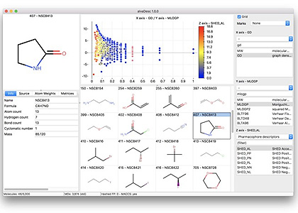 コデ社の「DRAGON」は、多種多様な記述子に対応していることが特徴で、国内でも人気があったが、基本的に6月末をもってグローバルに販売が停止される。ただ、コデ社は「alvaDesc」の販売元の役目を担っており、これが事実上の後継製品に位置づけられるようだ。実際、「alvaDesc」は「DRAGON」の機能をほぼ包含しているうえで、さらに多くの記述子(約5,000種類)が計算できるようになり、精度も向上している。塩やイオン液体などの非完全結合型の分子構造を扱うことも可能で、MACCS166フィンガープリント計算など「DRAGON」になかった機能も含まれている。