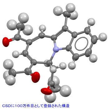 「CSD」に登録された100万件目の構造は、1-(7,9-diacetyl-11-methyl-6H-azepino[1,2-a]indol-6-yl)propan-2-one(CSD Refcode:XOPCAJ)。原著論文は山東大学(中国)のYao Wang教授らによるもので、Journal of the American Chemical Society(JACS)に掲載された。この論文では一群の特殊なカルコゲン結合触媒が報告されており、小さい分子を組み立てるのと同様な方法でN複素環式化合物を効率的に合成できるという。