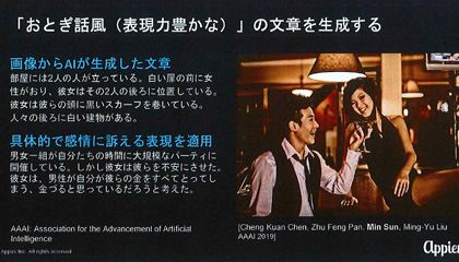 さて、スン氏は、AIは人間のような創造性を持つことはできていないが、「創造的な行動をすることはできる」とし、そのことを“コンテンツ作成”と“解決策の探索”の二つに分けて説明した。まず、コンテンツ作成だが、AIは人間のコンテンツ制作プロセスをまねているため、優れたお手本を人間が与えることが重要だという。例えば、文章の生成では、初期(2015年)の研究では写真からその説明文を生成したが、それは「少女がケーキを食べている」といった事実だけの写真説明に過ぎなかった。しかし、2019年の研究では、おとぎ話の例文を大量に学習させた結果、1枚の写真から物語風の文章をつくり出すまでになっているという。視点や文体を変えて文章を綴ることも可能。
