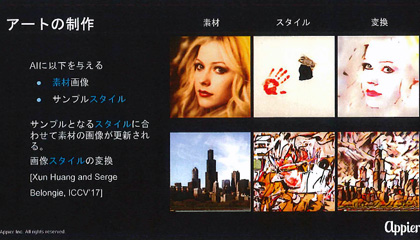 一方、2017年の研究で、アートの創作に挑んだ事例もある。もとになる素材の画像とアートスタイルを与えると、それらを合体させて新しい画像を生み出すというもの。同様の手法で音楽やダンスなどの表現も可能で、「AIが創造的にみえる振る舞いをしている」という。