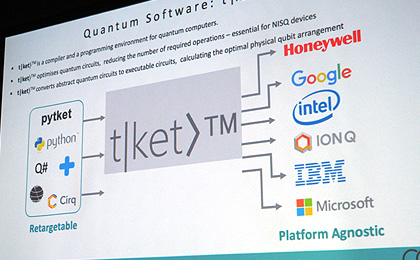 同社は量子コンピューターの上で動かすソフトウエアのための開発および実行環境を提供する企業で、独自開発の汎用コンパイラー兼プログラミング環境「t|ket」(ティケット)を製品化している。さまざまなプログラミング言語で書かれたソースコードを、各種の量子コンピューター向けにコンパイルすることができる。IBMなどのハードウエア開発企業と協業しており、ハネウェル、グーグル、インテル、IonQ、マイクロソフトなどが開発しているマシンでもソフトを動かすことができるという。とくに、量子回路を最適化し、演算回数を削減できるようにするほか、プログラム実行時には抽象的な量子回路を実行可能な回路に変換し、最適な物理量子ビット(キュービット)への配置を割り当てることが可能。「t|ket」を介することで、異なる量子コンピューター間のアプリケーションの移植も容易になる。