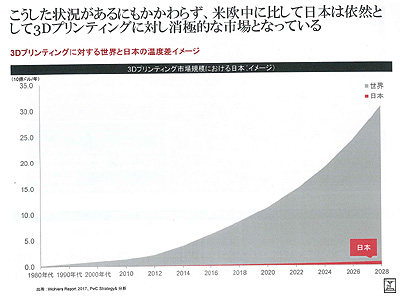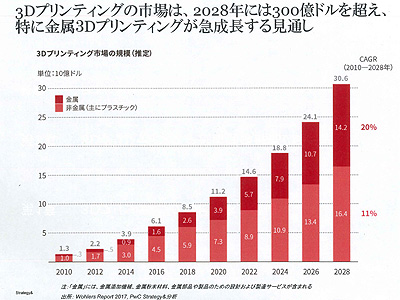 2020.01.25−PwCコンサルティングの戦略コンサルティングチーム“Strategy&”は22日、3Dプリンティング、Additive Manufacturing(付加造形・積層造形)の成長性に着目した調査レポート「3Dプリンティングの未来:価値創出とビジネスモデル変革の可能性」を作成したと発表した。市場規模は2018年で85億ドルだが、2028年には300億ドルを超えると予想。とくに、航空宇宙、医療、自動車分野における成長率が高く、素材も樹脂に加えて、金属が大きく伸びるという。ただ、グローバルの動向に比べて、日本国内市場の動きは鈍く、このままではデジタル技術をフル活用する欧米との格差がさらに開くと危惧している。レポートの日本語版には、国内向けの提言をまとめた「終章」が付加されている。