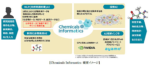 化合物ディスカバリーAI「Chemicals Infomatics」は、長年蓄積してきた製造業への知見と、AIテクノロジーに関するノウハウを化学・材料分野の研究開発に応用したもの。AIによる探索手法を用いることで、既存製品にとらわれない新たな領域の素材や化学物質、代替材料などの有望化合物を探索し、効率的に発見することを狙いとしている。