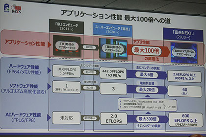 「富岳NEXT」では、アプリケーション性能を「富岳」の100倍に向上させる計画。実際、ハードウエアの進歩による貢献は6倍ほどで、アルゴリズムやソフトウエア面での改善が大きな要素になるとしている。理研では、先進的なアプリケーション開発の支援を行うとともに、文部科学省と米エネルギー省(DOE)との「ハイパフォーマンス・コンピューティング及びAIに関する事業取り決め」に基づく米研究機関との共同研究も実施。国内では、大学および研究機関と協力しながら、AI処理向け機能の有効活用や、AIによる複雑な処理を補助するライブラリーの整備、AIによるコード開発・最適化のサポートなどの取り組みを推進している。