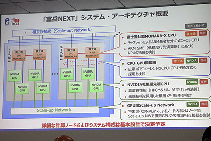 「富岳NEXT」では、CPUに富士通が開発中の「FUJITSU-MONAKA」を発展させた「FUJITSU-MONAKA-X」(仮称)を採用。加速部にはNVIDIAが設計する並列演算性能とメモリー帯域に優れた新型GPUを組み合わせ、CPUとGPUを密接に結合させたシステムになる。2030年時点で、世界最高のAI性能を持つCPUと世界最強のGPUが統合された世界最高のAIスーパーコンピューターになることを想定している。